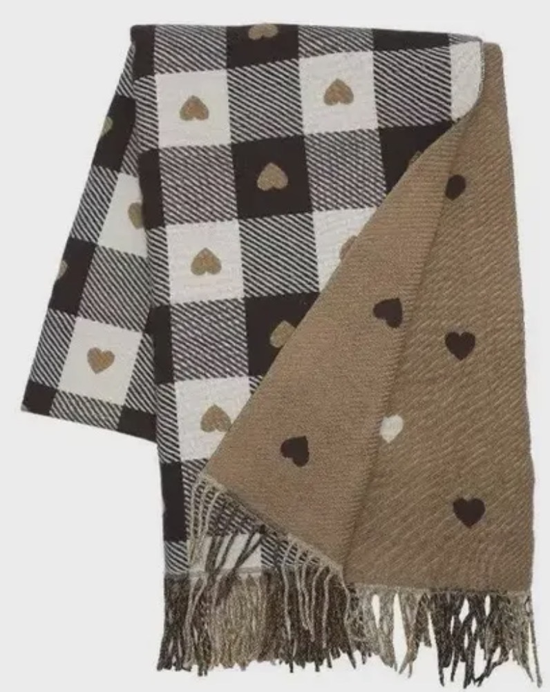 Härlig vävd halsduk med fransar och hjärtan. Rutig på ena sidan och enfärgad på andra sidan.