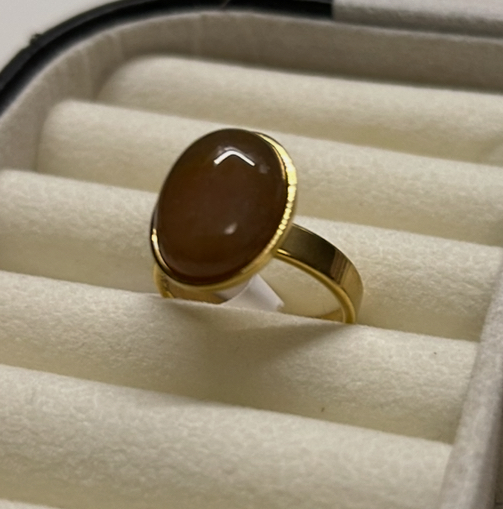 Ring i stål med rödbrun sten.
